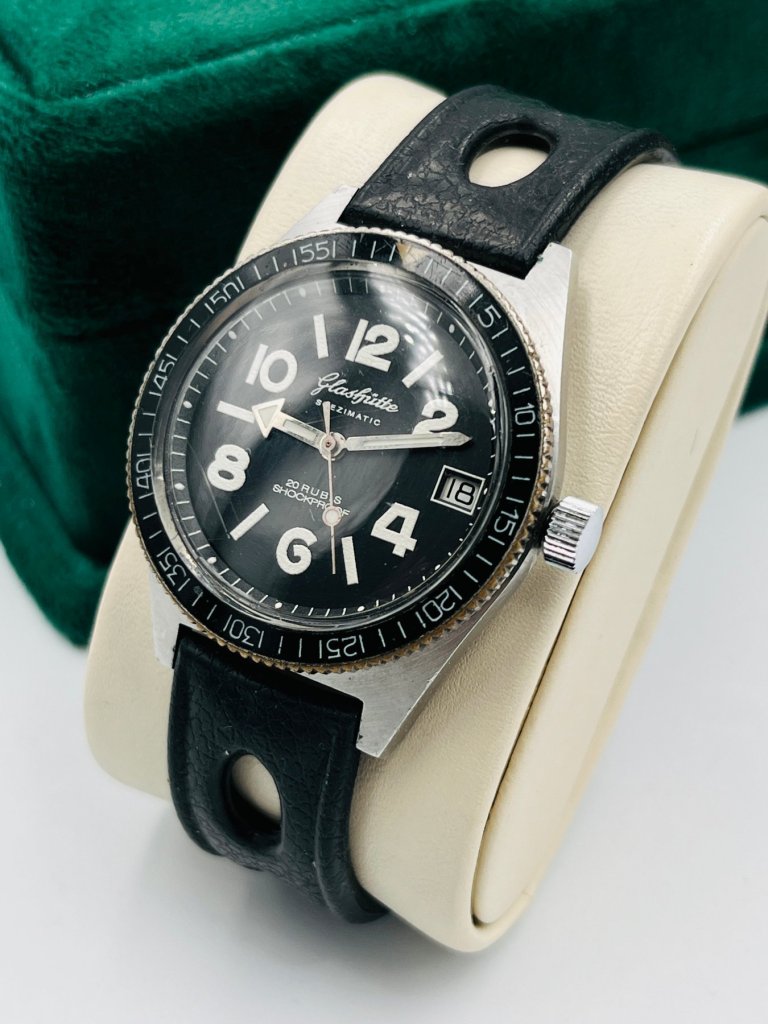 Anfang September wurde auf Catwiki (Auktionsplattform) folgende Uhr als RP TS 200 Glashütte Taucher verkauft. Ohne Blick in das Werk, fallen sowohl das falsche Zifferblatt (20 Rubis??) als auch die falsche Lünette auf. Das Gehäuse ist zwar ein Wasserdichtes Tauchergehäuse der Marke RP, jedoch mit den falschen Markierungen für eine Uhr aus Glashütter Produktion.