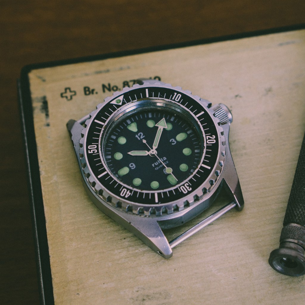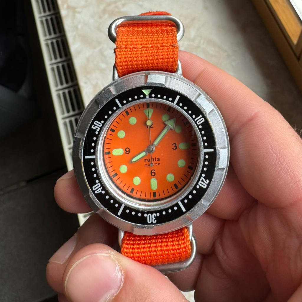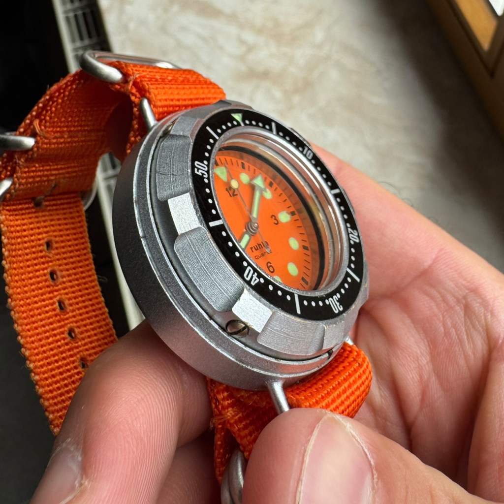 Auf die Uhren aus Glashütte folgte die allein in der DDR entwickelte Ruhla „Kampfschwimmer“, welche erstmals um 1985 in die Truppe zum Testen kam. Über diesen Prototypen ist noch recht wenig bekannt. Mit seinem unkonventionellen, massiven Gehäuse und orangenem Zifferblatt sticht es in jedem Fall aus der Masse raus.