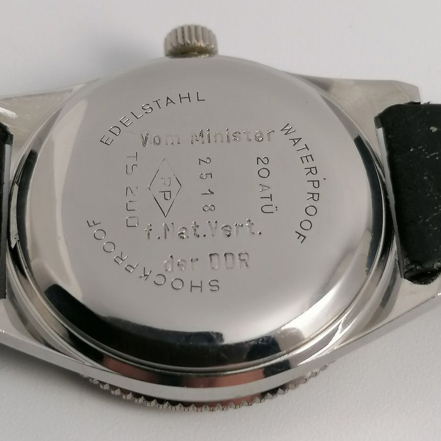 - Nummer 2035 wurde zu Testzwecken an Bediensteten der NVA ca. 1970 ausgegeben. Er sollte die Uhr tragen und über Mängel oder ausfälle Protokoll führen. Mängel gab es seinerzeit nicht. Uhr verblieb beim „Tester“