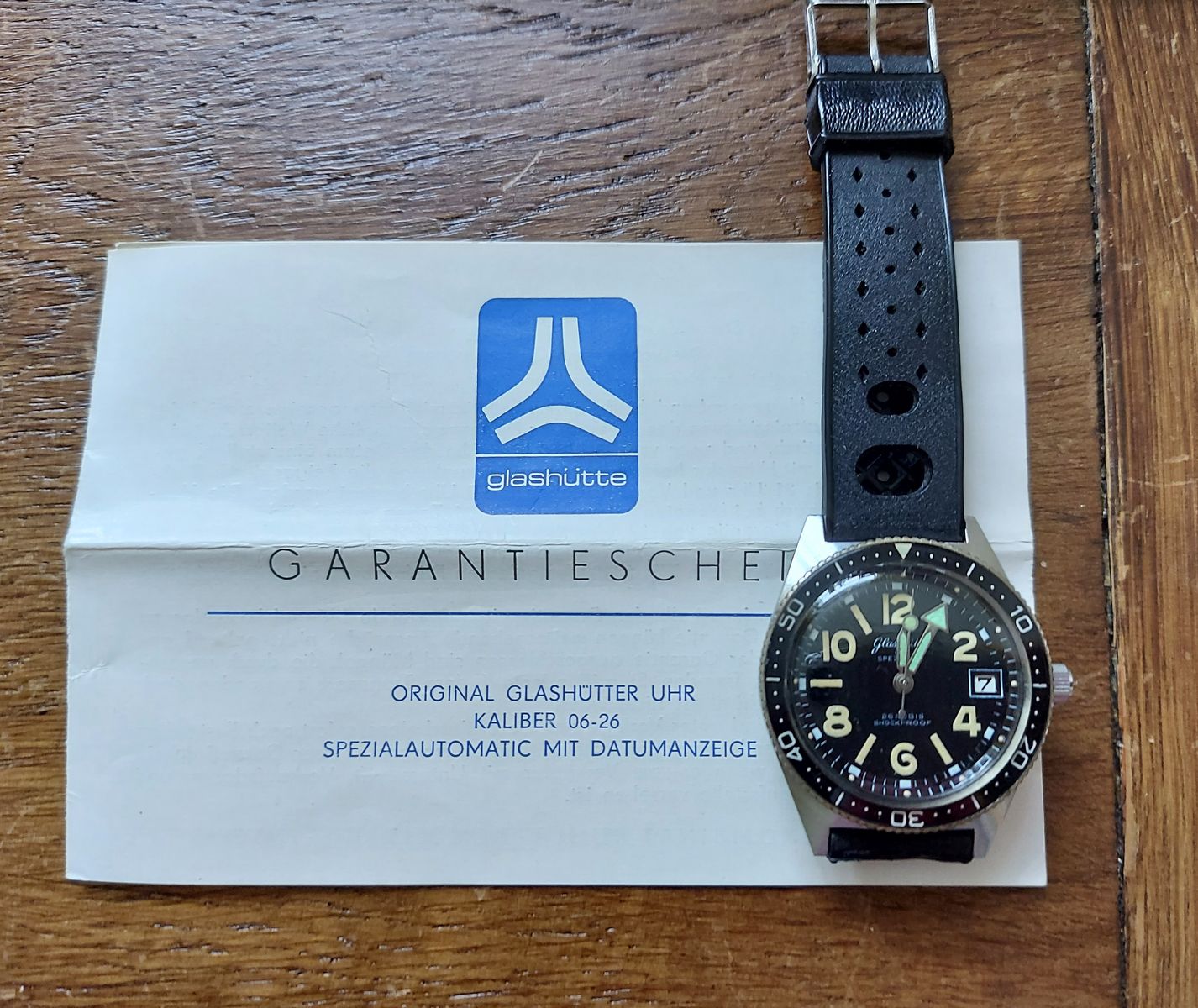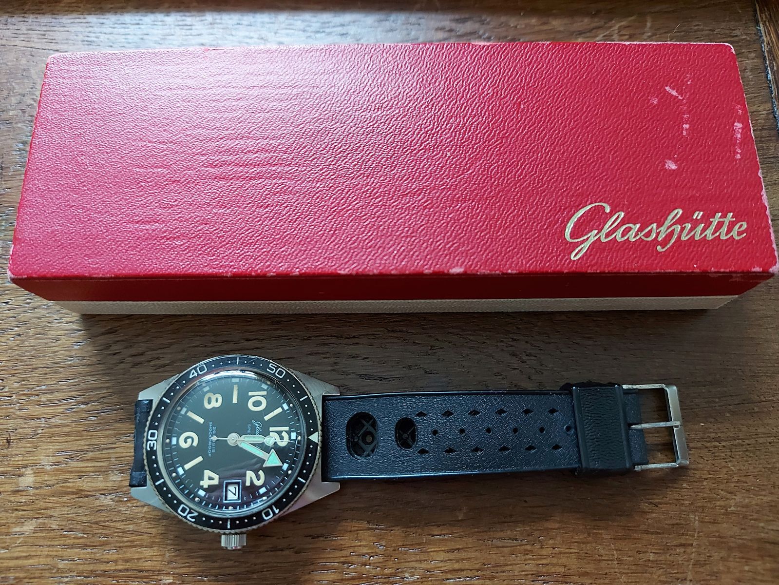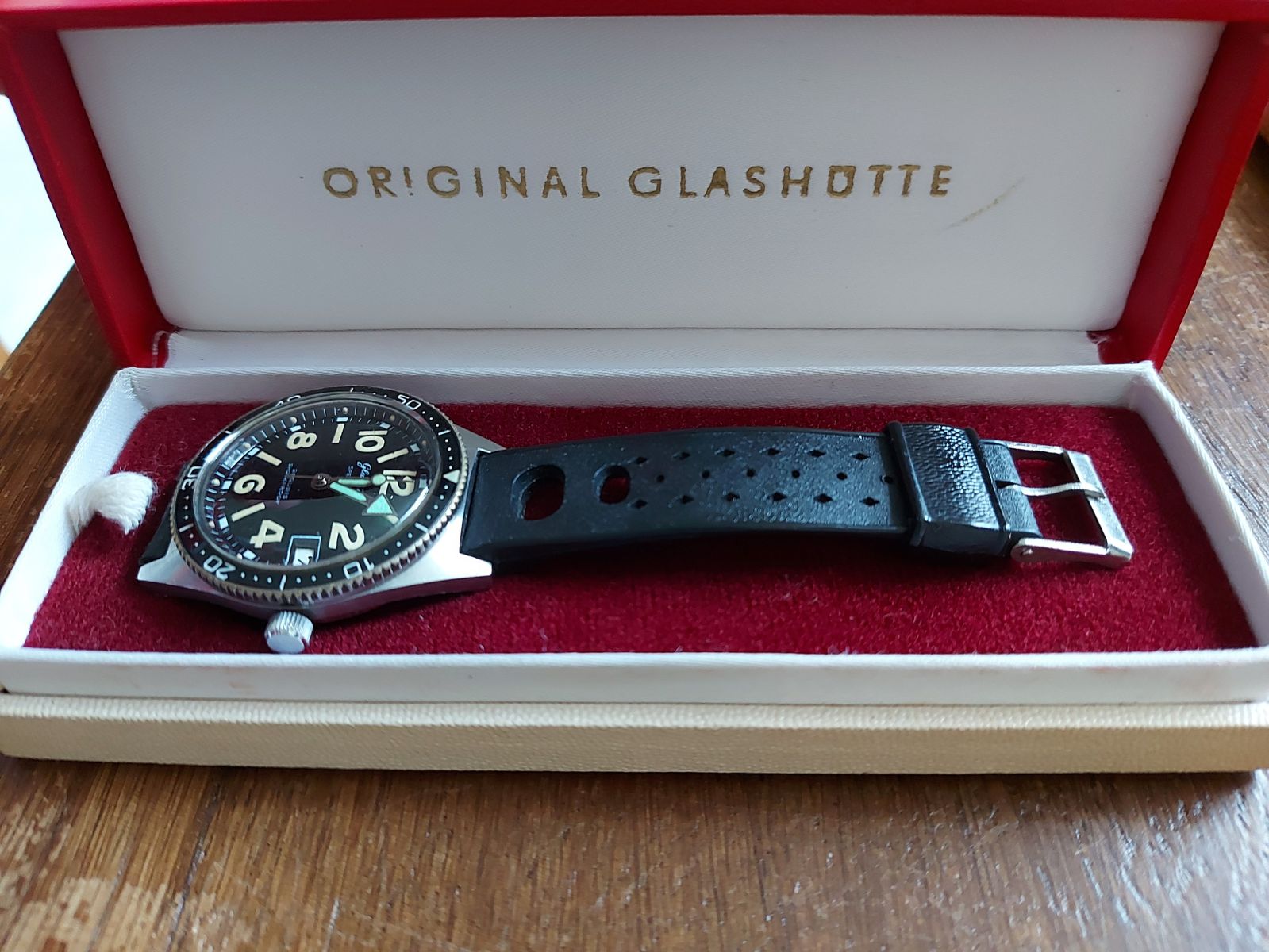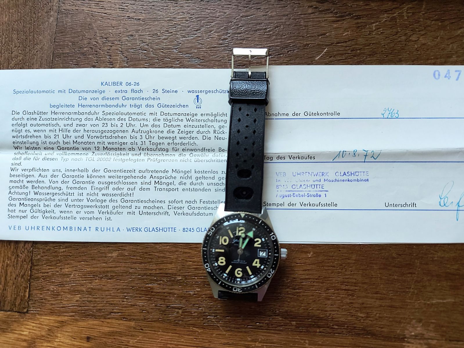 Unterstützt wird diese Theorie, da die einheimisch produzierten Zifferblätter mit „Made in GDR“ Aufdruck, ebenfalls stark grüne Lume der Ziffern aufweisen (siehe Bilder unter „Zifferblatt“)