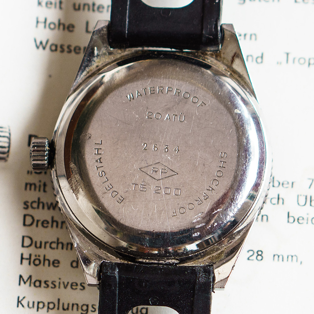 Als Mitte der 1960er Jahre die wasserdichte Taucheruhr bei Glashütte entwickelt wurde, gab es keine wasserdichten Gehäuse aus DDR Produktion. Daher wurden für die RP TS 200 Edelstahl Gehäuse von der Firma Richard Pfisterer (RP) aus der BRD importiert. Warum man keine eigene Produktion wasserdichter Gehäuse aufgebaut hat konnte noch nicht ermittelt werden. Möglicherweise war die geplante Stückzahl zu gering und daher ein Import der Gehäuse gegen Devisen rentabler.