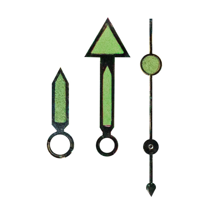 Die Zeiger sind im Vergleich zu den Vorgängeruhren weiterhin unverändert. Insbesondere der Minutenzeiger ist als auffälliger Pfeilzeiger gestaltet. Alle Zeiger sind mit Tritium belegt.