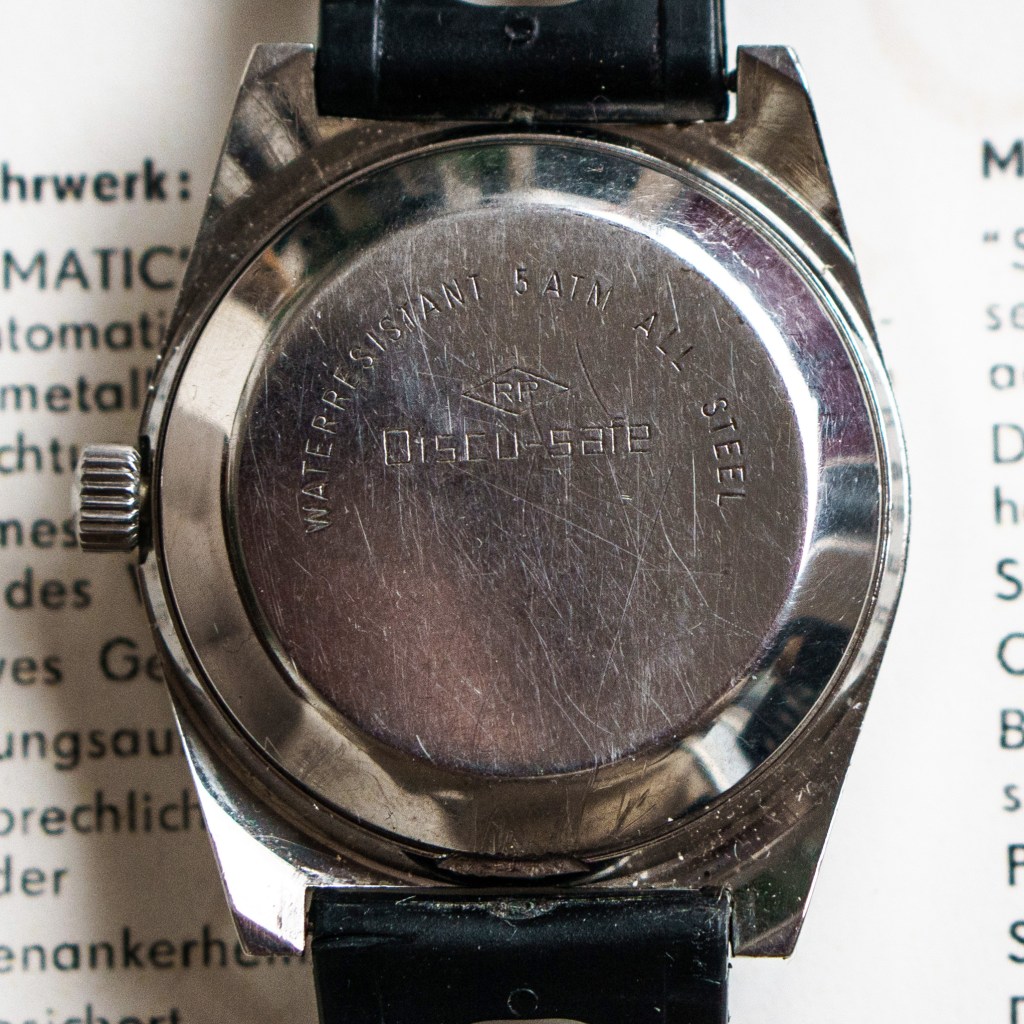 Der gedrückte Bodendeckel ist wie das Gehäuse aus Edelstahl gefertigt. Offensichtlichstes Merkmal und ist das RP Logo (Richard Pfisterer) in der Raute und darunter liegenden DISCU-SAFE Schriftzug. Der umrandende Text weist die Tauchtiefe mit 5ATM, also 50m aus.