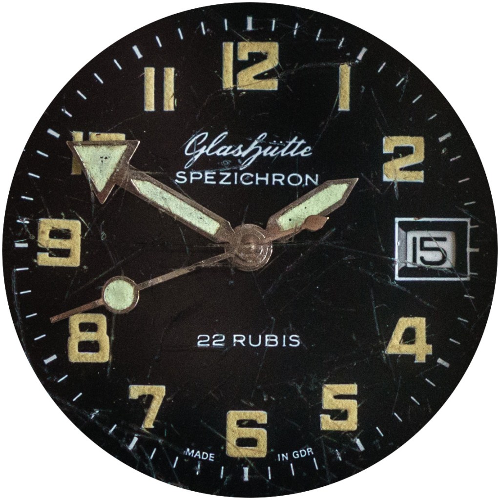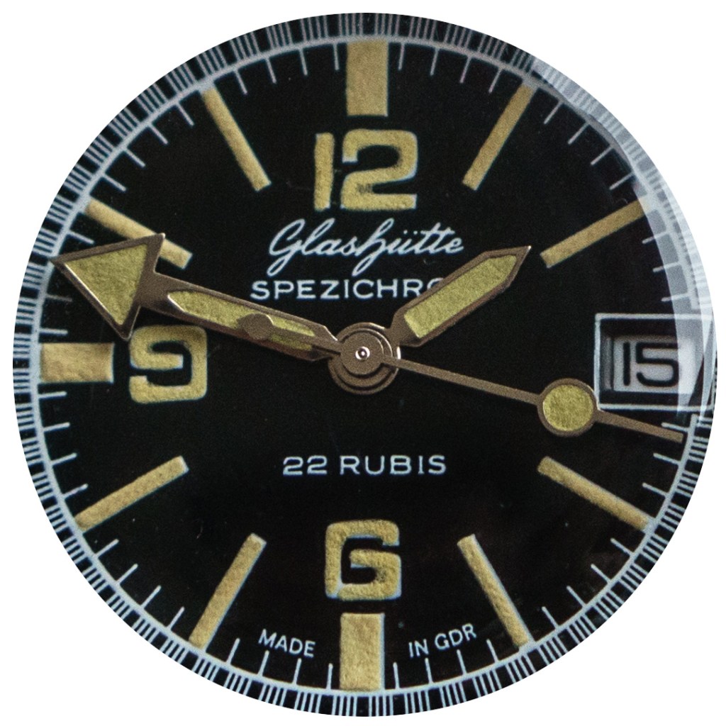 Der obere Teile ist geprägt durch den bekannten Glashütte Schriftzug, darunter „SPEZICHRON“. Der untere Teil nennt „22 RUBIS“. Rechts ist das Datumsfenster, umrandt von einem weißen Feld. Versionen ohne Datum sind nicht bekannt Versionen mit Datum und Tagesscheibe dagegen schon.