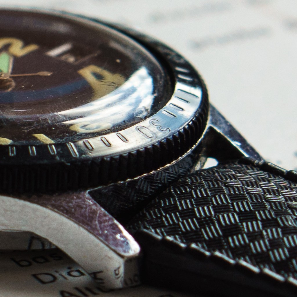 Die Lünette der Vorserienuhr war gänzlich aus Plastik ohne leuchtendes Dreieck auf 12 Uhr. Die Lünette ist klassisch gehalten, mit einer Minuterie von 0 bis 60, wobei die Zehnerschritte immer als Zahl abgebildet werden. Die Minuterie ist im Plastik versenkt und mit weißer Farbe ausgefüllt (welche leider schnell abgerieben wurde).