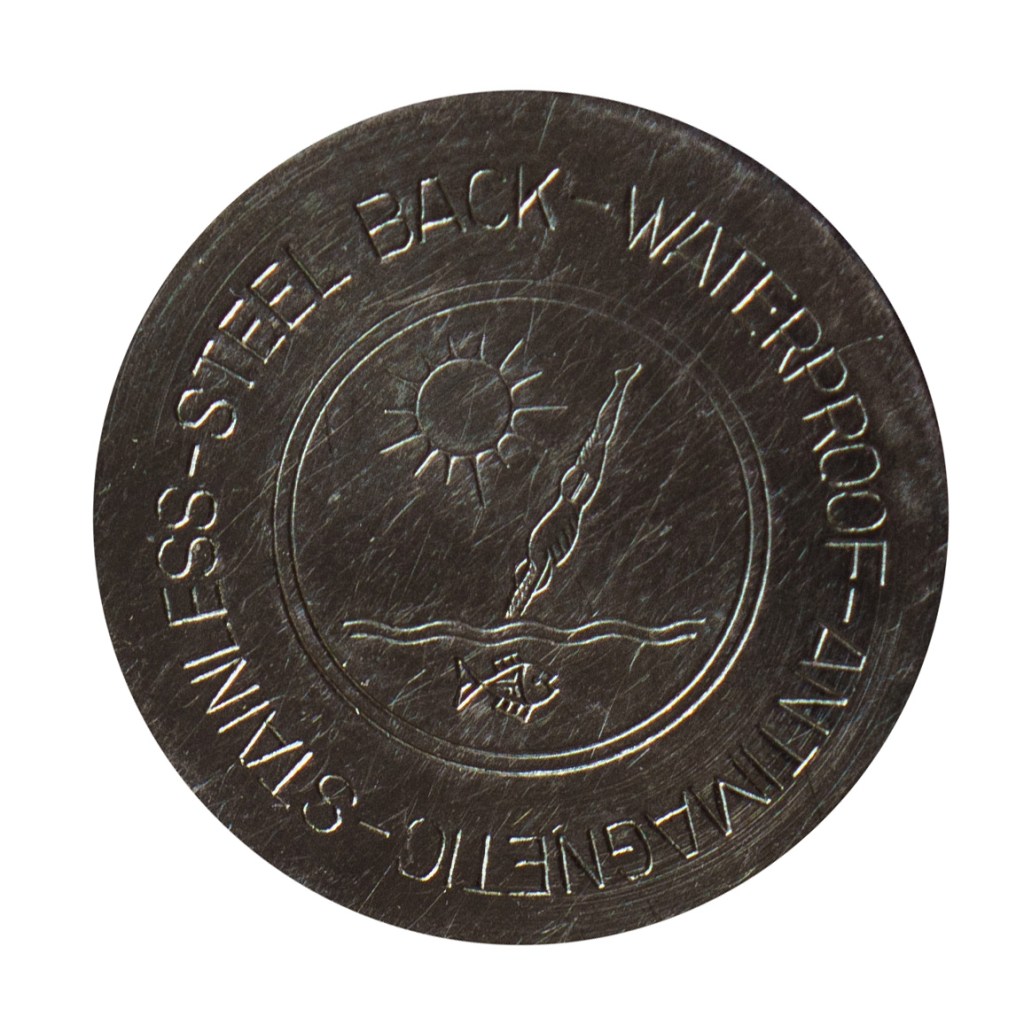Der geschraubte Bodendeckel ist im Gegensatz zum Gehäuse aus Edelstahl gefertigt. Im Zentrum des Deckels sind ein ins Wasser springender Schwimmer / Taucher, die Sonne und ein Fisch dargestellt.